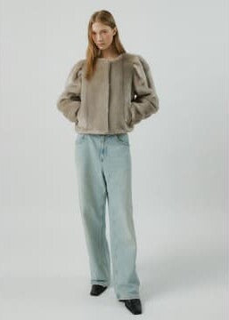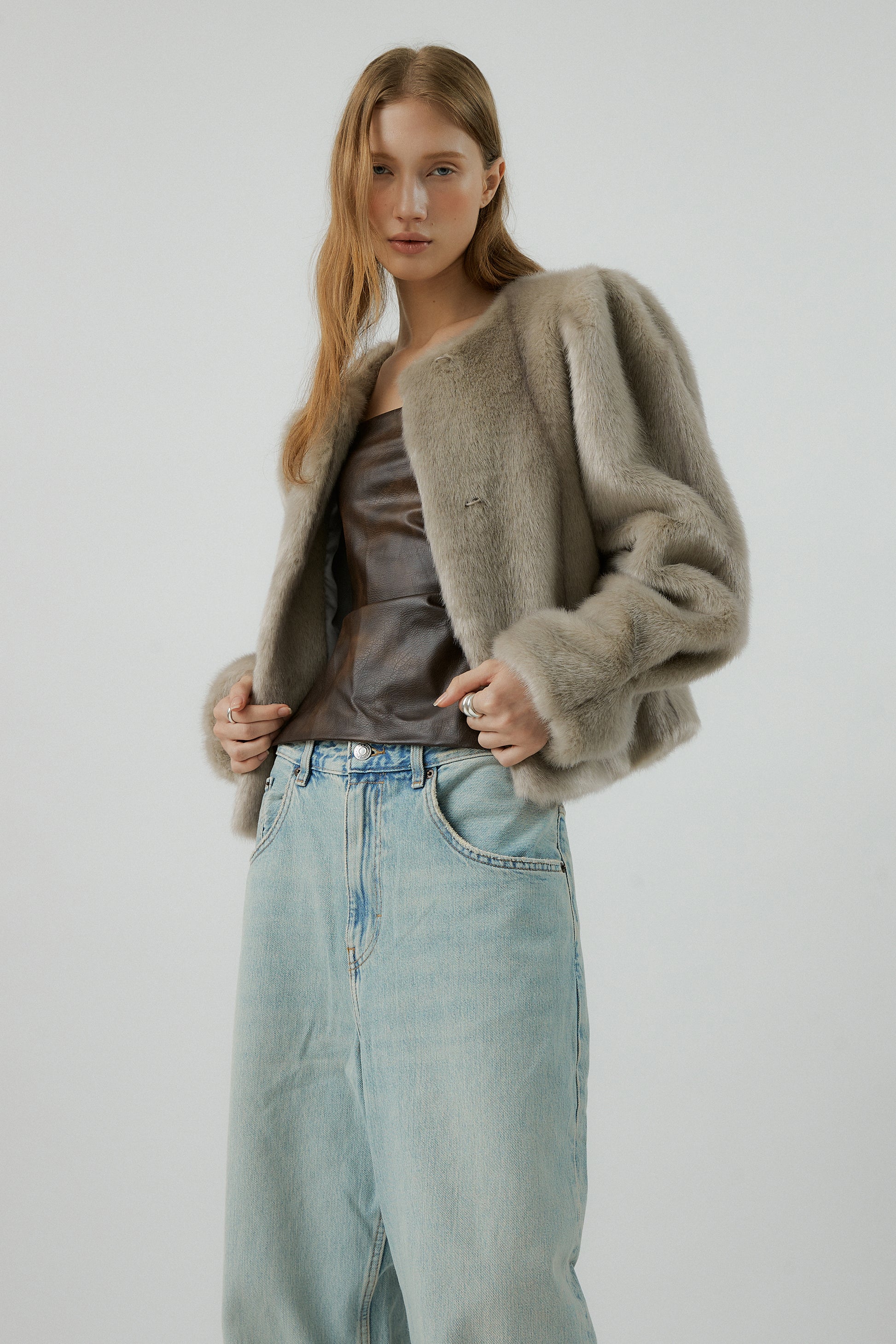 Made of luxurious faux fur fabric with a subtle stripe pattern, shirring points at the shoulders give this cropped jacket an elegant and sophisticated feel.