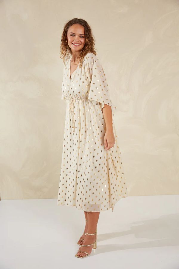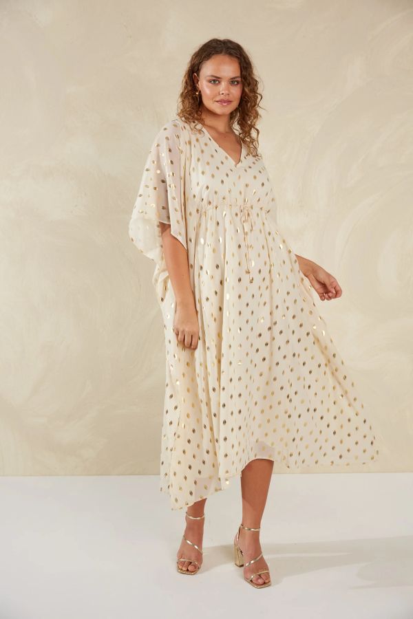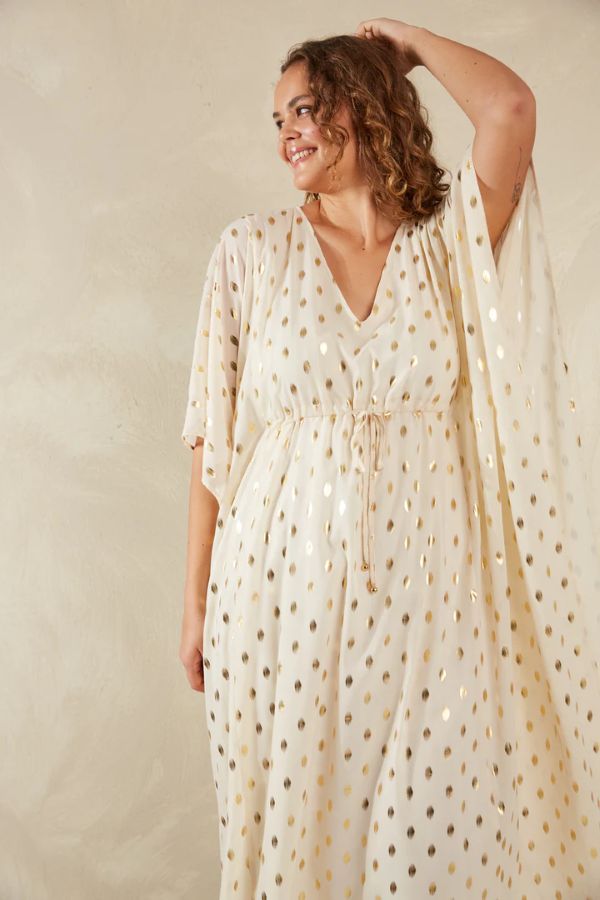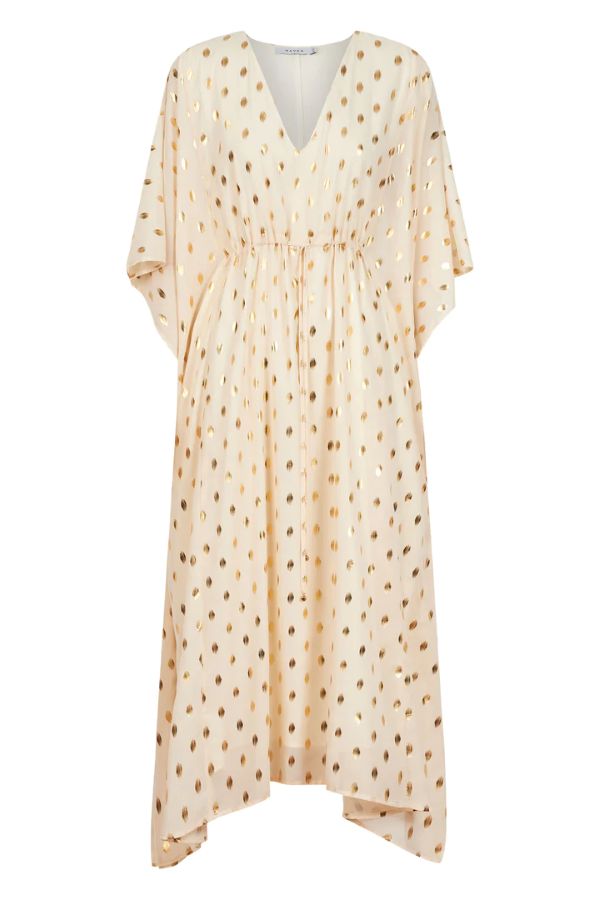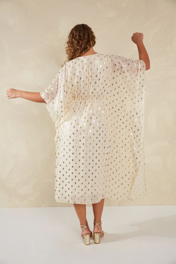 The Sanremo Kaftan radiates the charm of a luxurious Mediterranean getaway. Floaty and feminine, this kaftan brings a touch of elegance to your summer style. It showcases a flattering V-neck, sheer kimono sleeves, an adjustable drawstring, and a dainty handkerchief hem. The lovely gold foil patterning creates a stunning contrast against its neutral tones. Style it with heeled sandals and metallic arm candy for a glamorous ensemble.