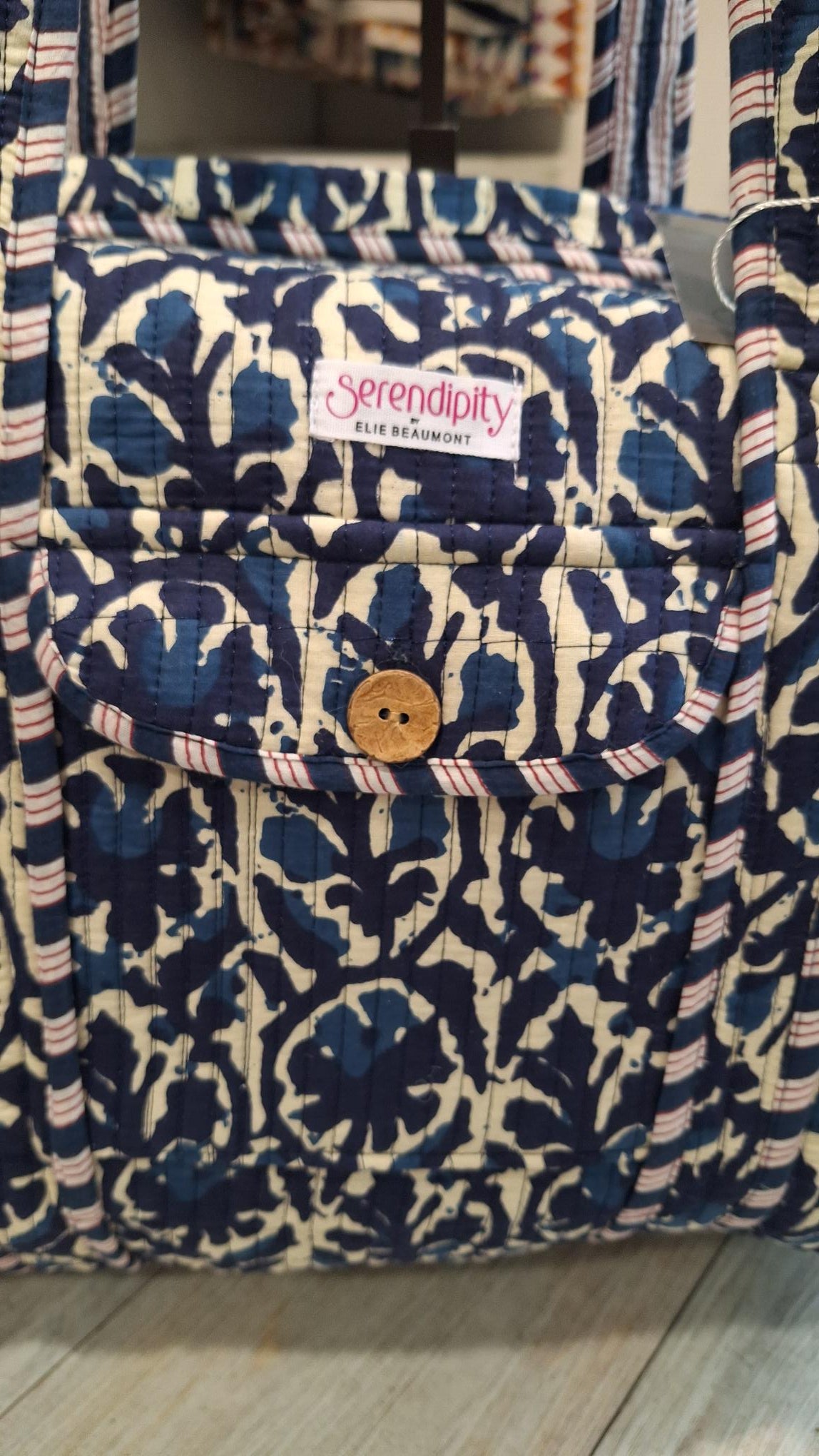 The block printed duffle bags are hand made by skilled craftsmen and women in small batches. Quilted with cotton for durability but lightweight and spacious, the Ladies Cotton Duffle bag is ideal for travel, a day around town shopping, trip to the yoga studio or gym, or simply a stylish replacement for your handbag.