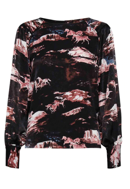 Satin shirt with western style pony print. Wide cuffs and a puff sleeve.