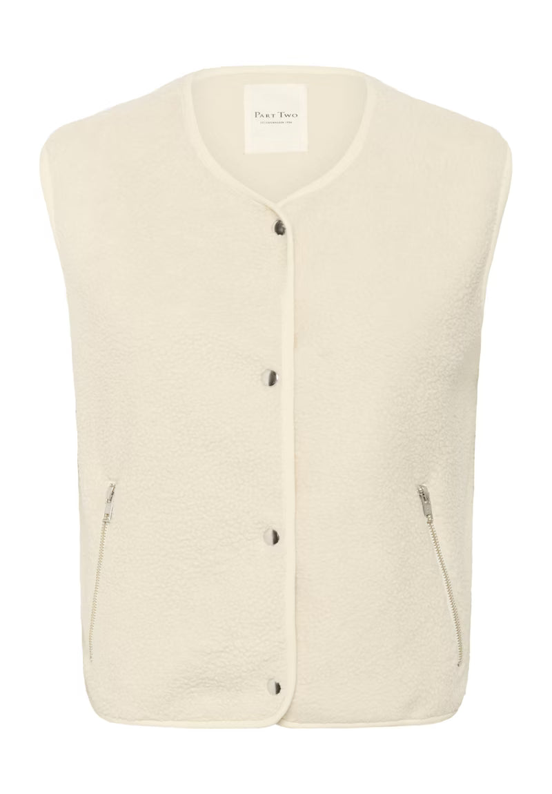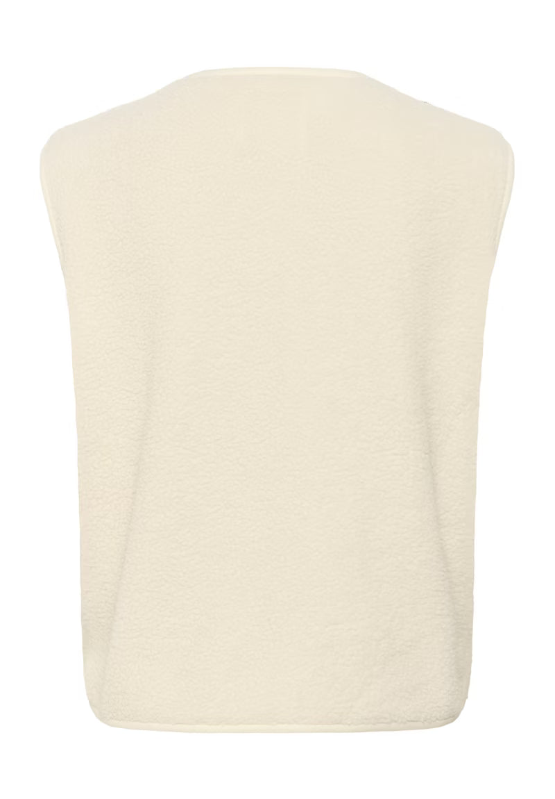 The model is 175 cm tall and wears a size 36. This soft teddy fleece vest features snap buttons and zipped front pockets. With its slightly boxy fit, it's ideal for layering over a tee or under a jacket during transitional seasons.