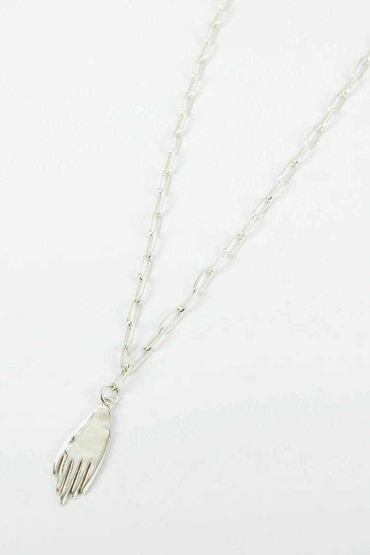 Silver link chain featuring a delicate hand charm. Finished with a clasp closure.