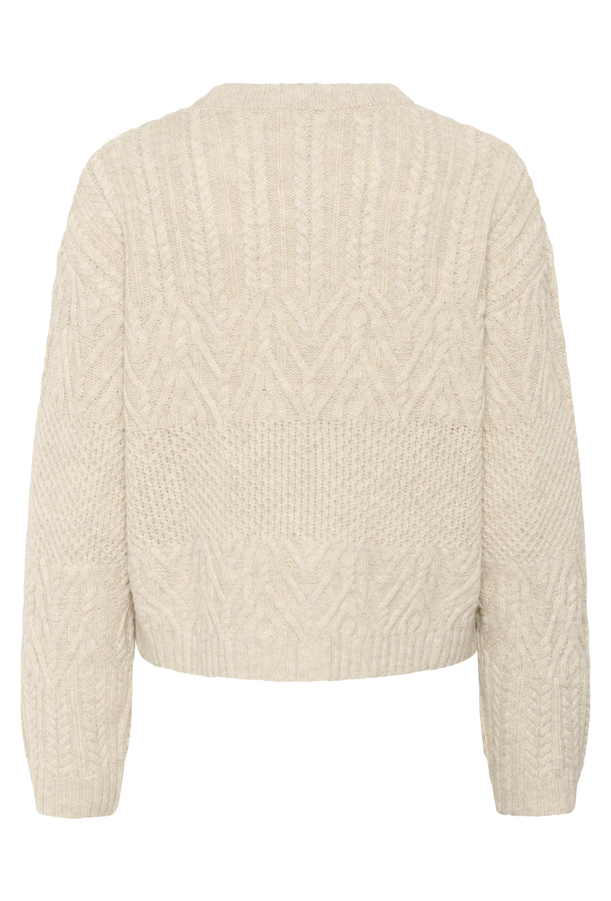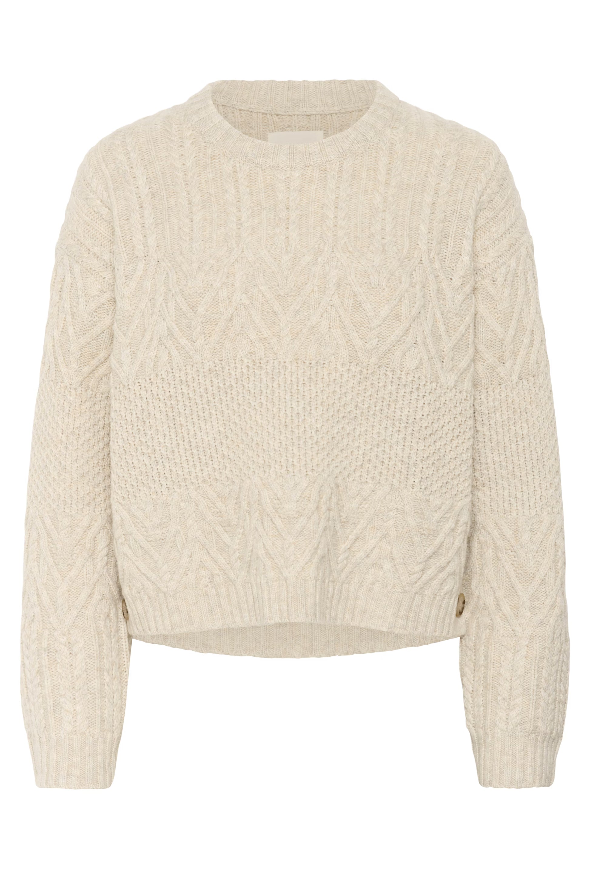 The model is 177 cm tall and wears a size M. This warm knit stands out with its beautiful texture and decorative side buttons. The heavy knit quality and varying patterns add a handmade feel. Pair it with everyday jeans or a leather skirt for a modern twist.