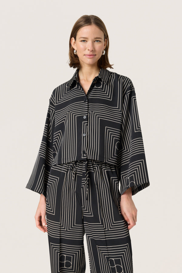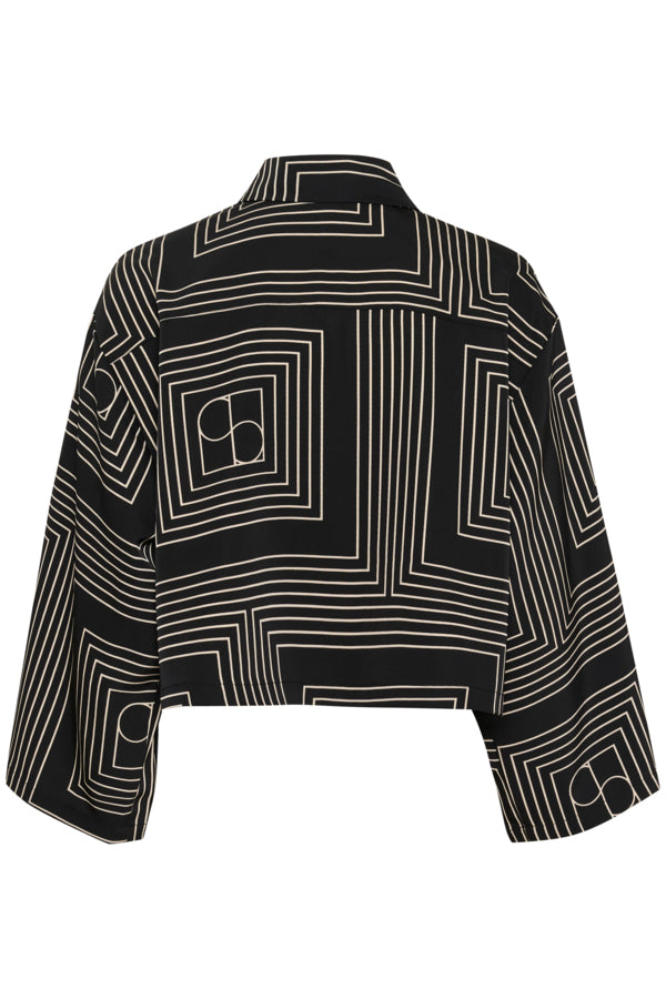 Boxy shirt in black with an exclusive monogram print and wide sleeves. The lightweight fabric and cropped silhouette give it a modern, relaxed look with edge. The model is 178 cm tall and wears size M.