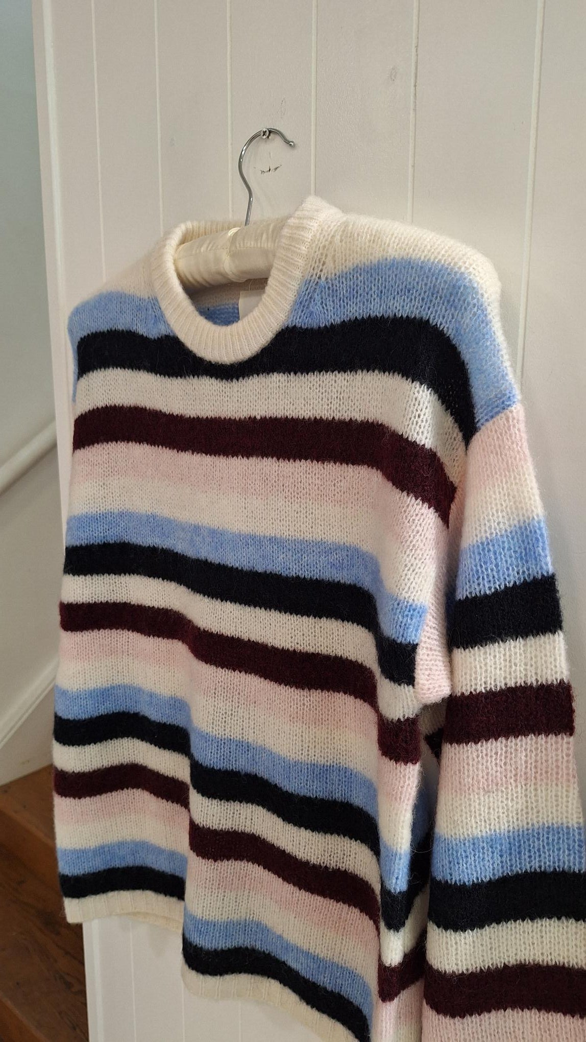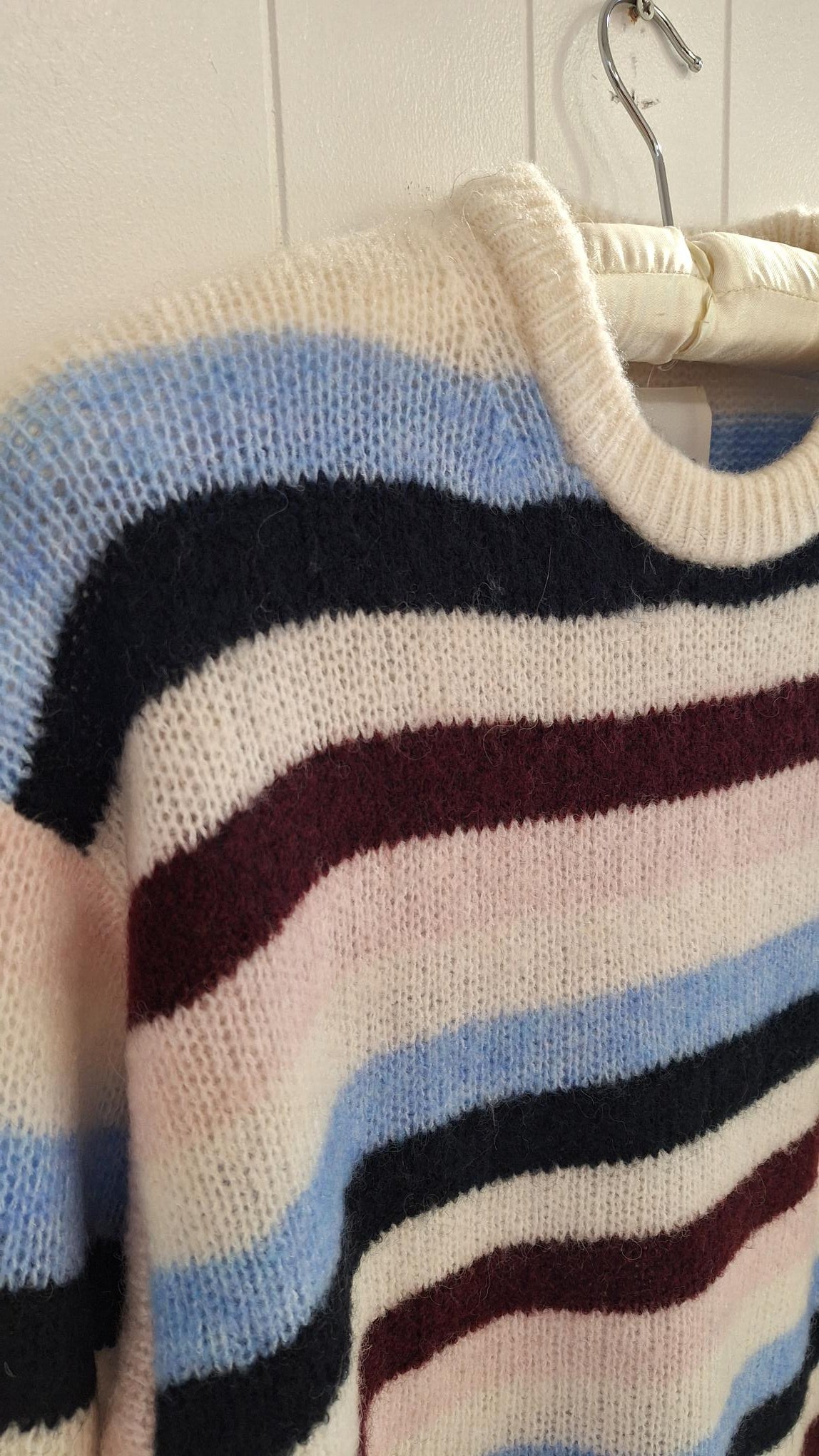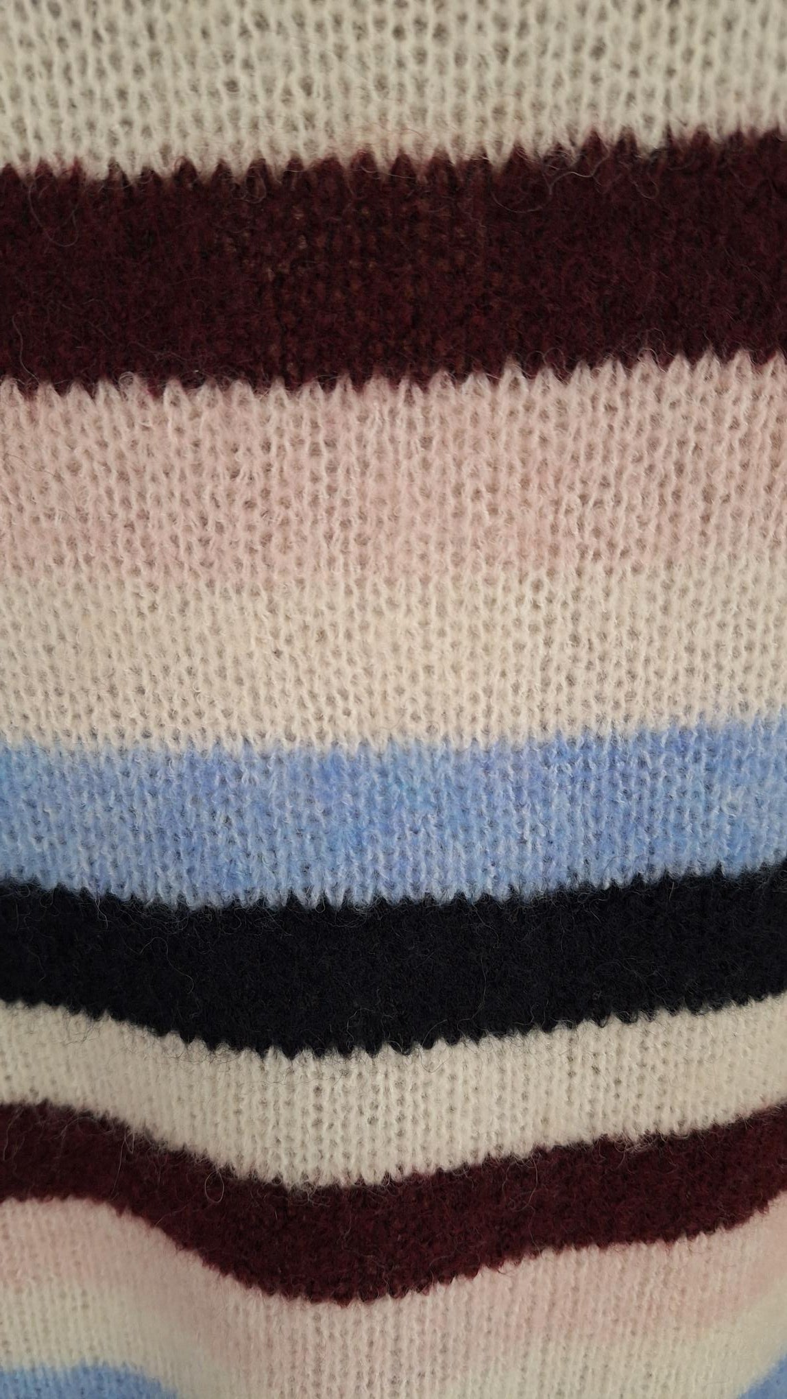 The model is 177 cm tall and wears a size S. This warm knit stands out with its beautiful texture knit and statement stripes in this seasons colours. Pair it with everyday jeans or a leather skirt for a modern twist.