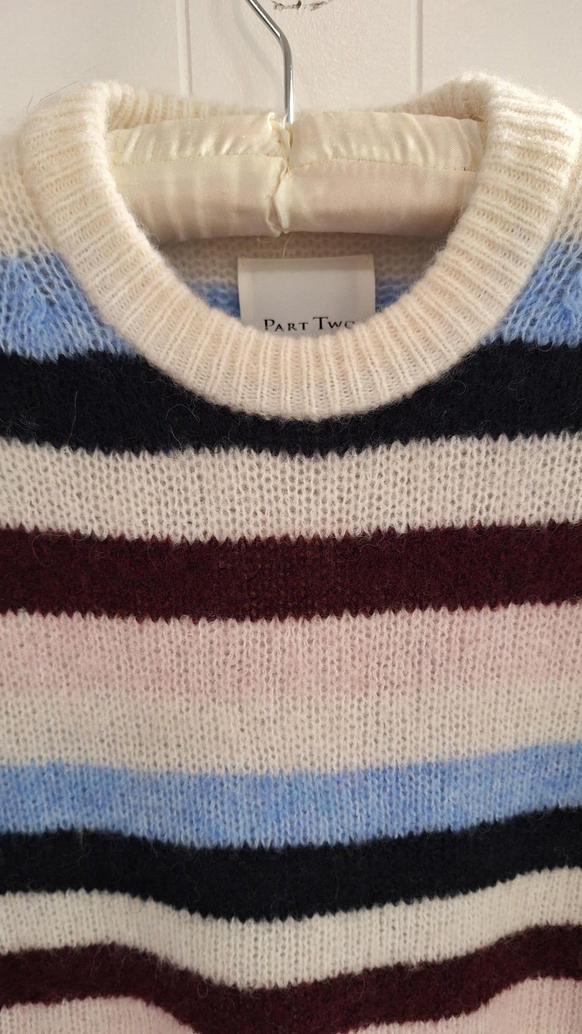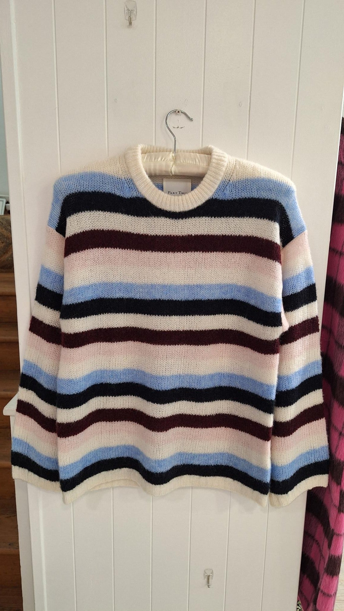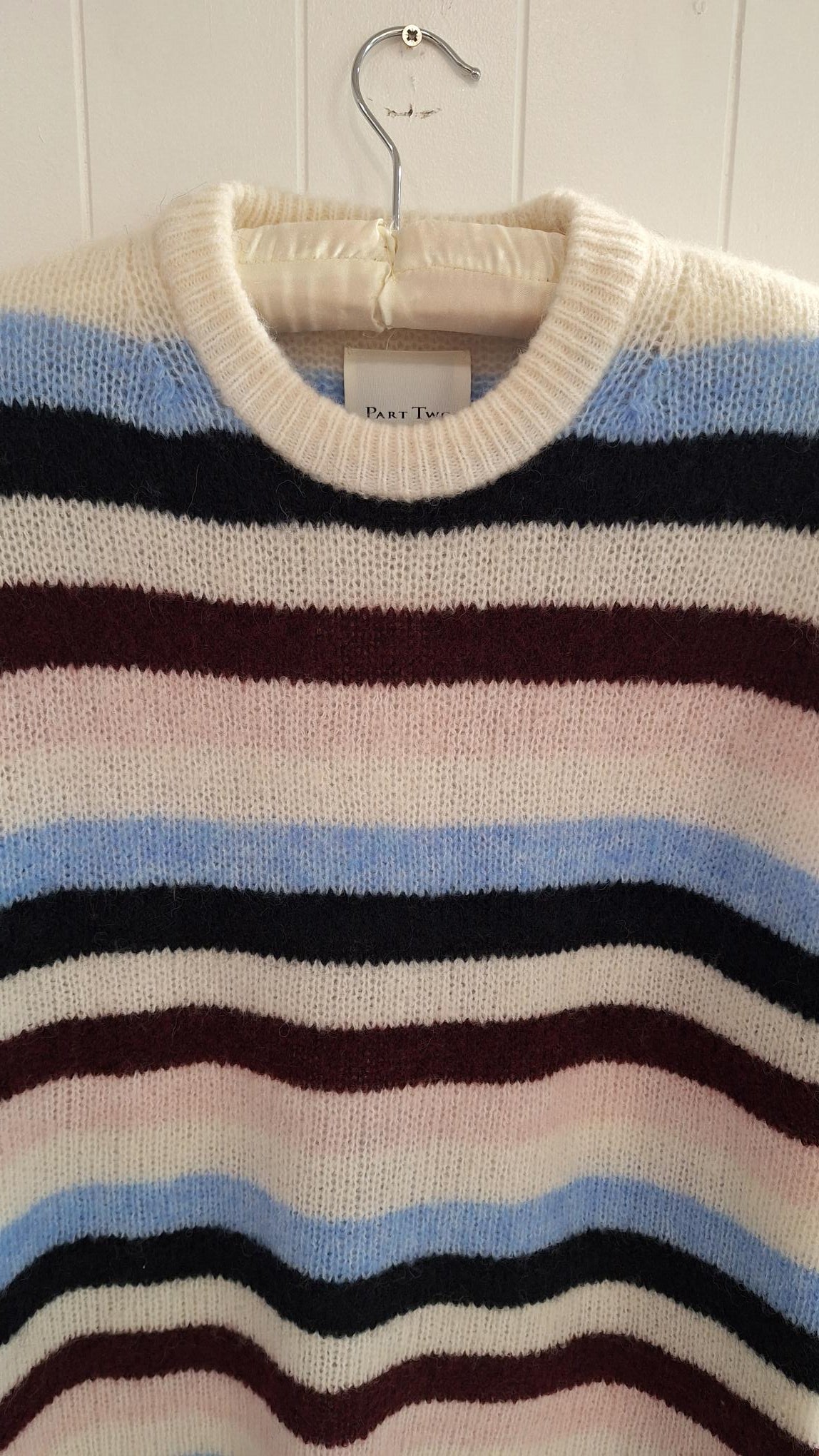 The model is 177 cm tall and wears a size S. This warm knit stands out with its beautiful texture knit and statement stripes in this seasons colours. Pair it with everyday jeans or a leather skirt for a modern twist.