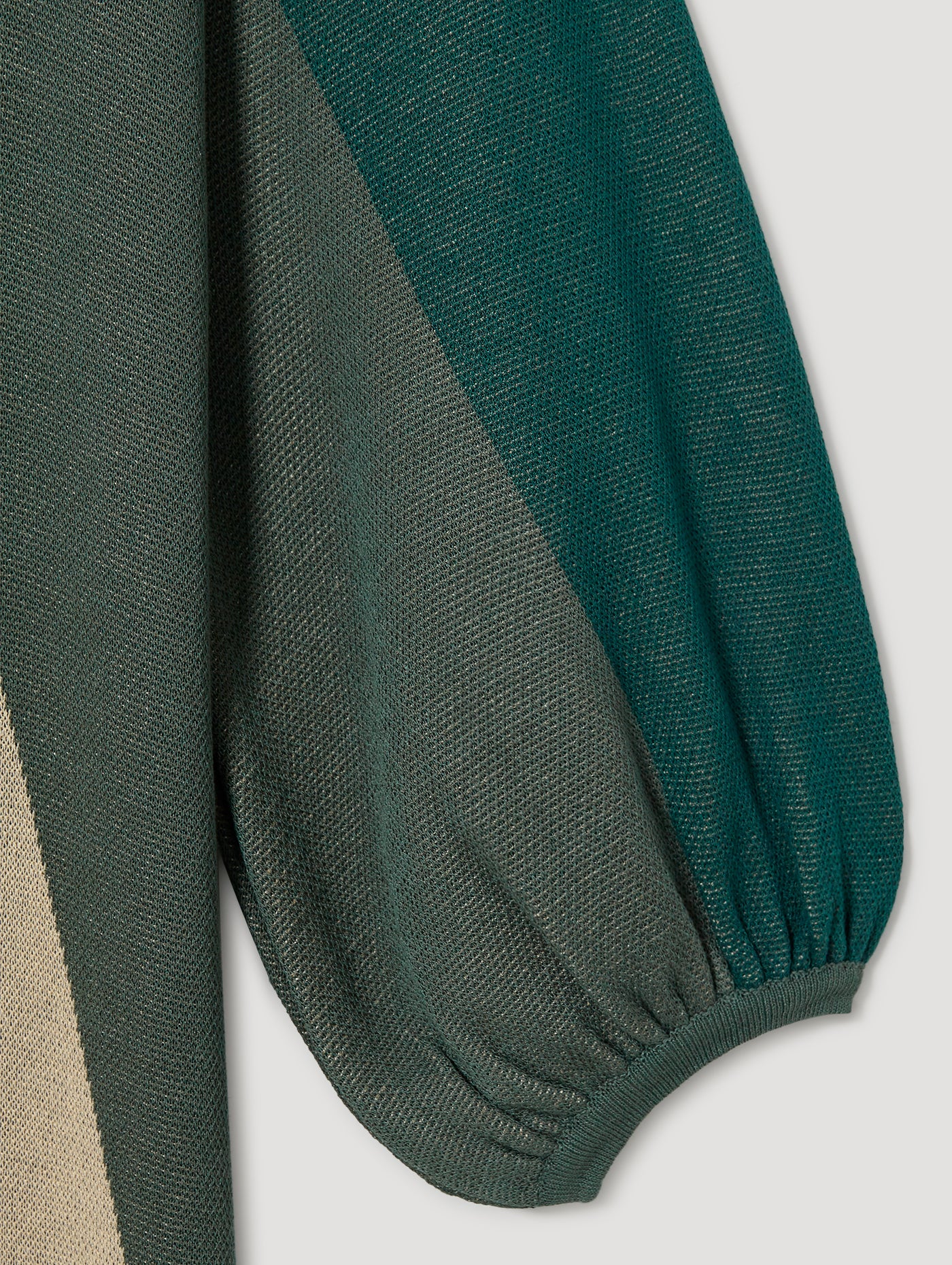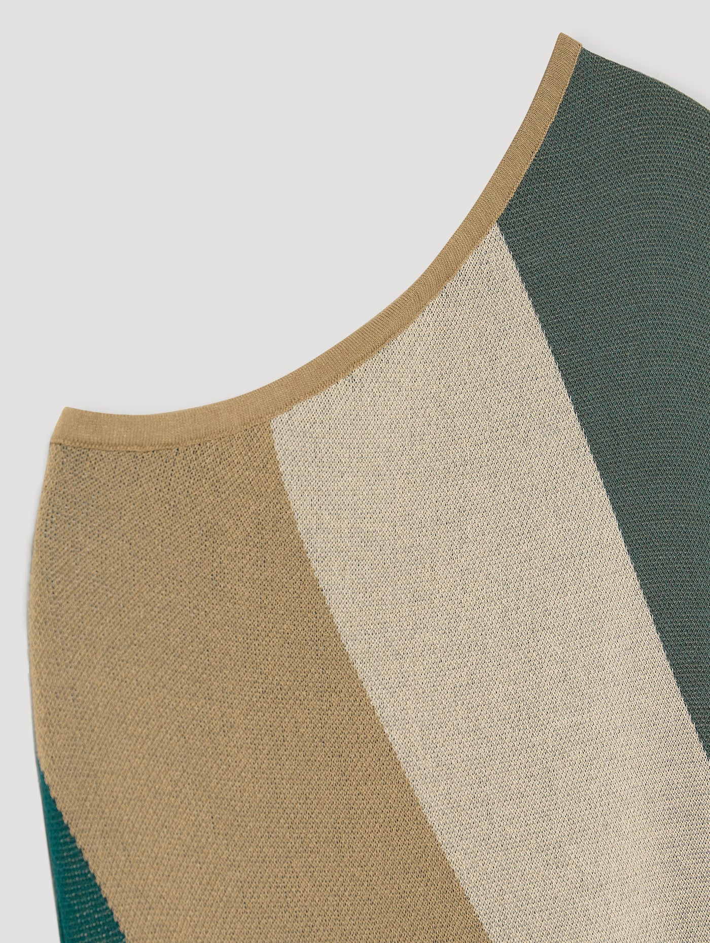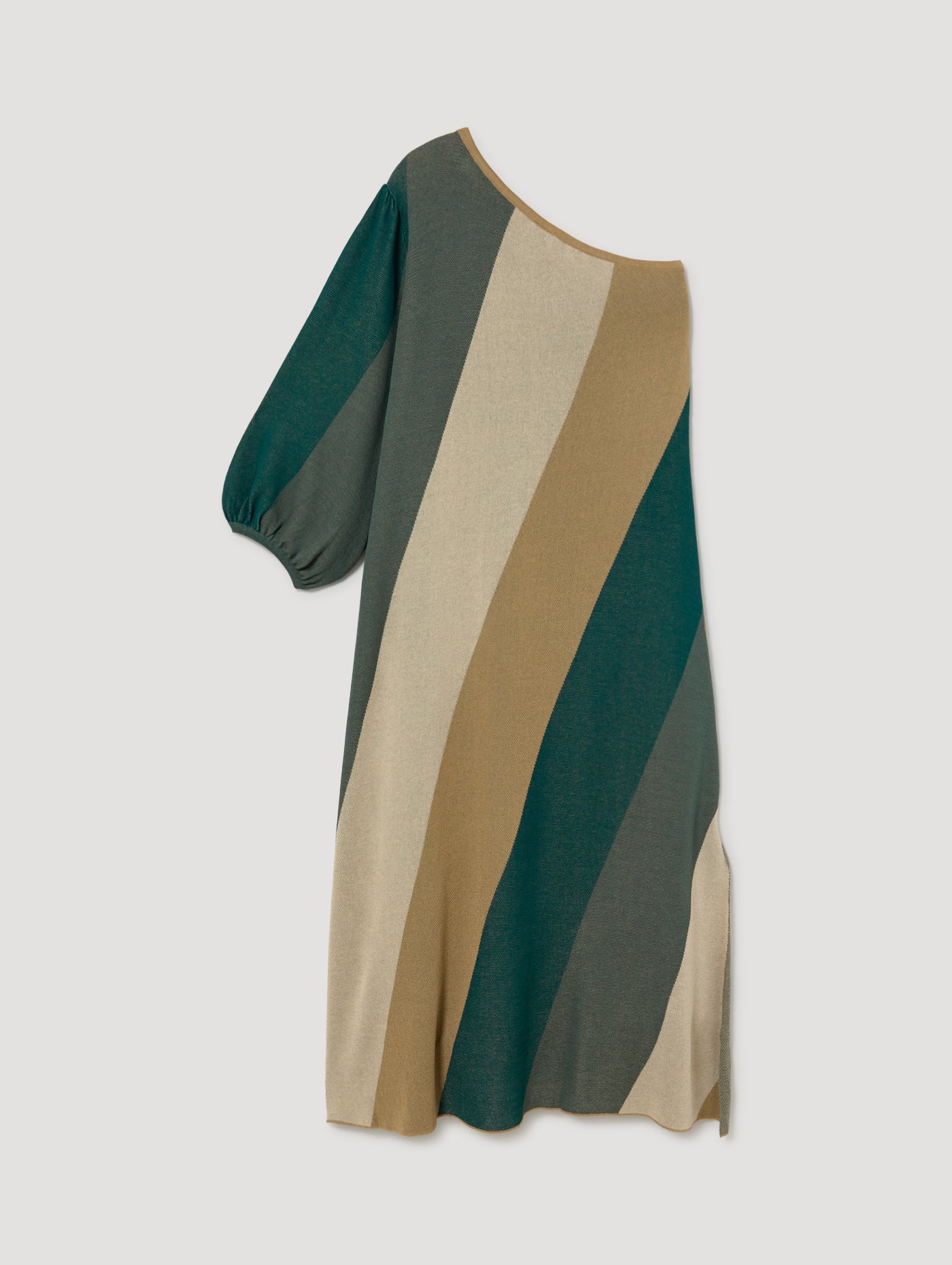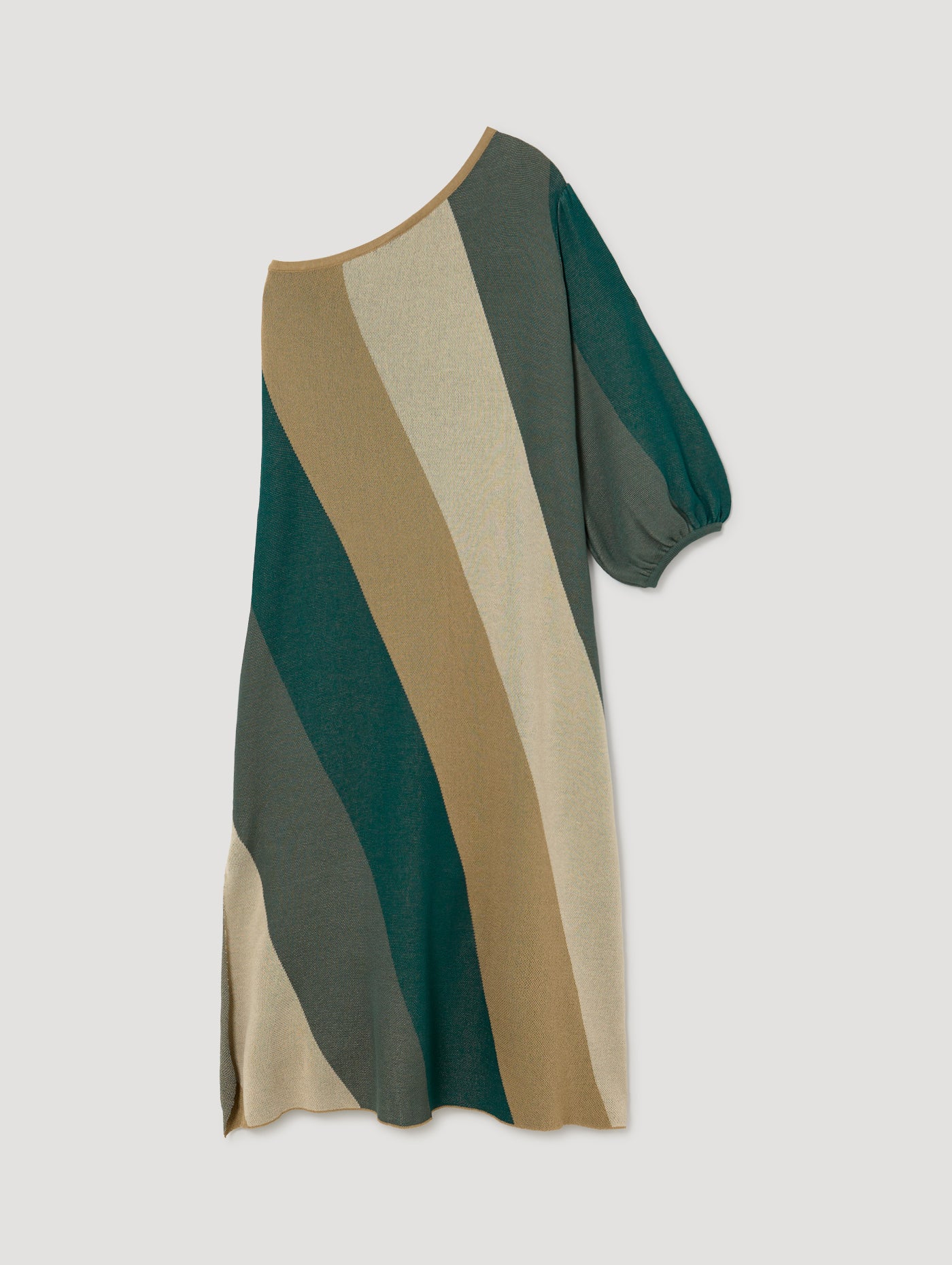 Fabulous single sleeved dress in striped knit. This looser fit, midi dress is as comfortable as it is sexy. Pair with gold necklace and gold sandals for an elegant Summer option during the day or evening.