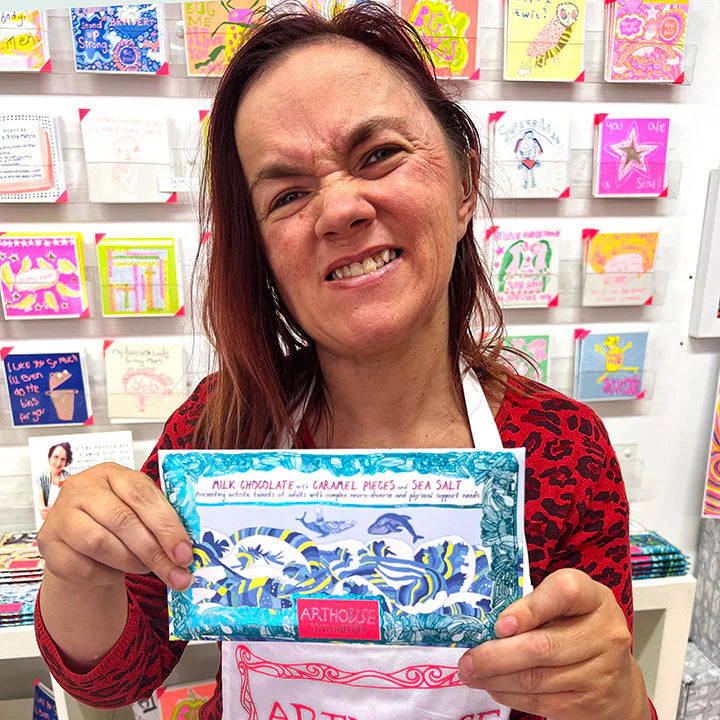 A mouth-watering milk chocolate with caramel & sea salt chocolate bar. Made in the UK with responsibly sourced single origin cocoa, this best-selling bar features the artists' original Swim with Whales artwork presented in a shimmering turquoise frame. Wrapped in coloured foil & encased in a recyclable envelope, An ideal gift for whale fans, chocoholics, art lovers & good-cause supporters everywhere!