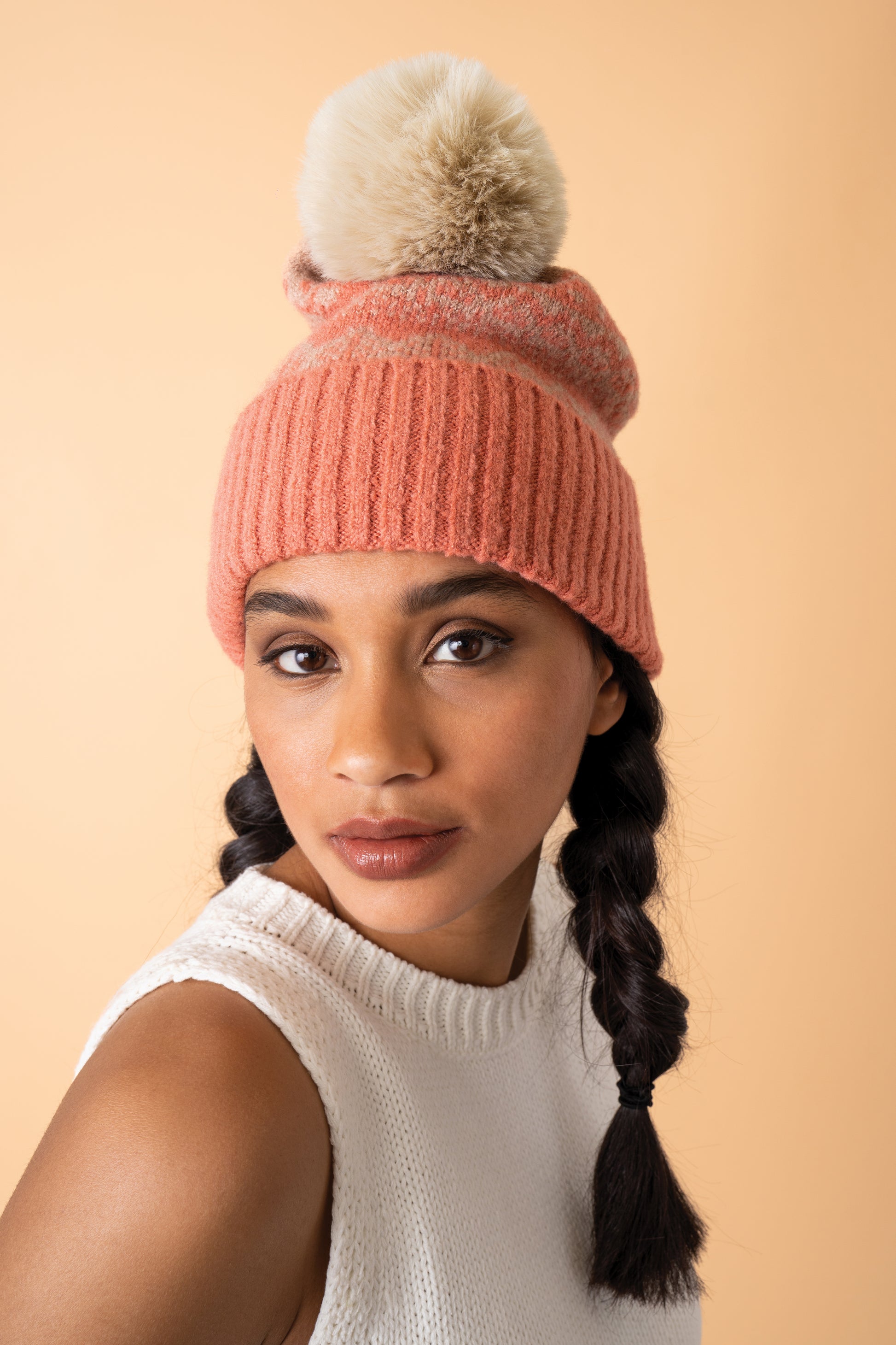 Thora Bobble Hat in Coral and Taupe