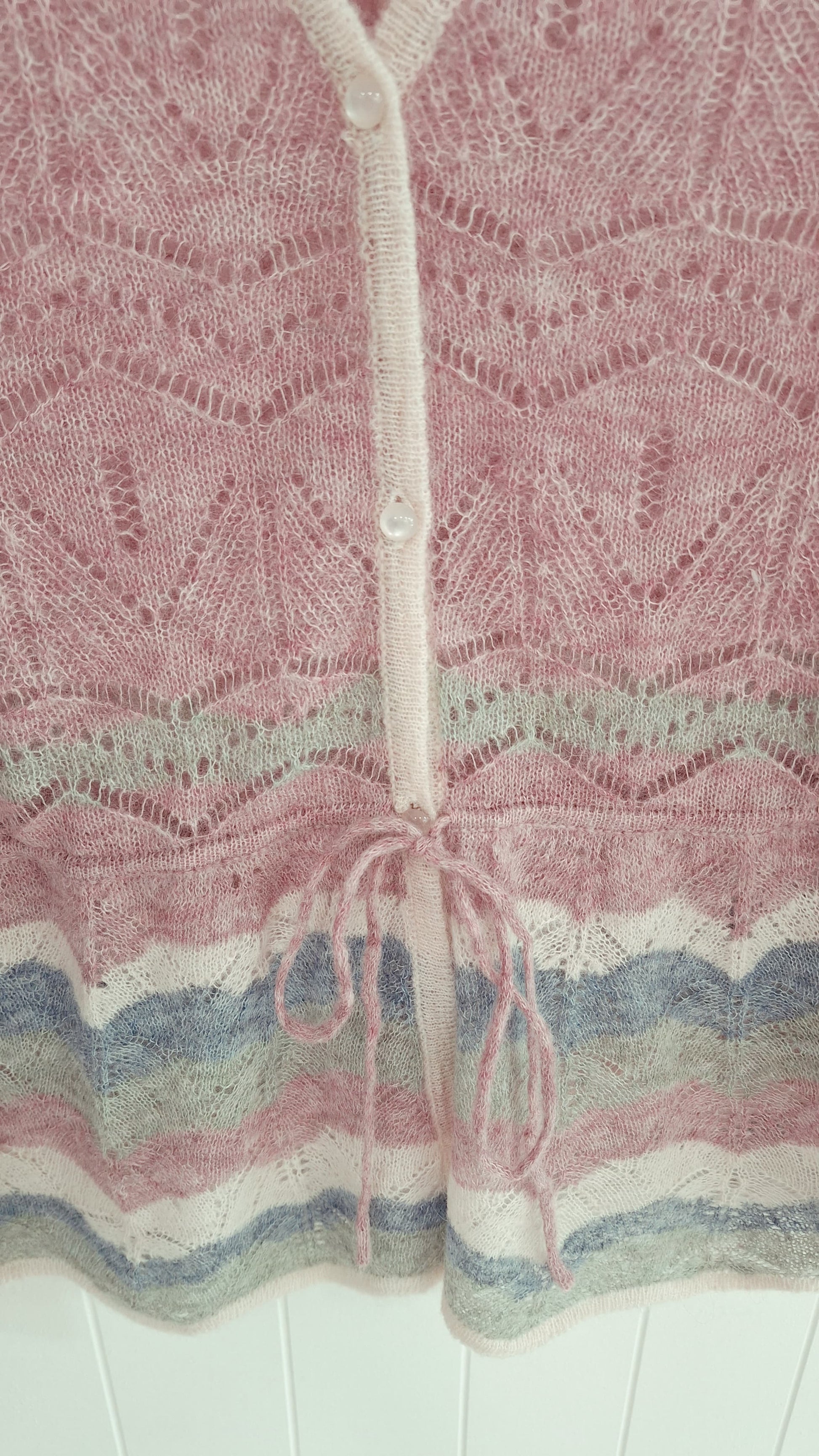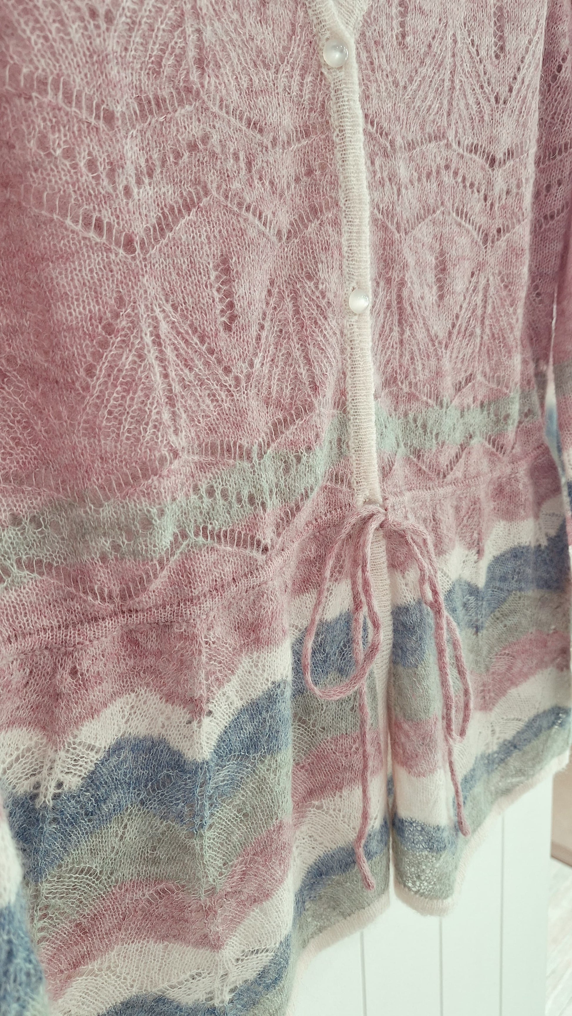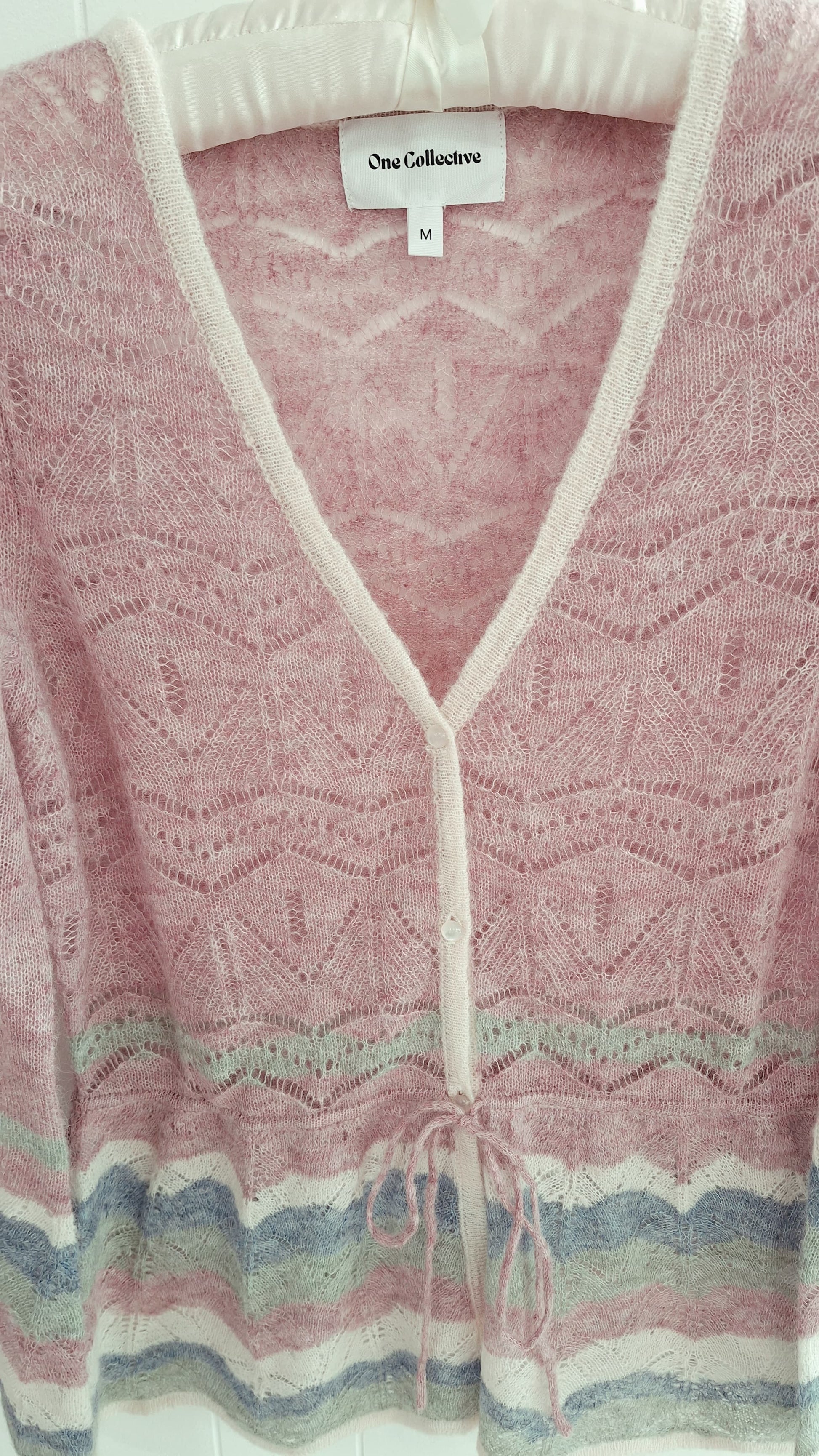 Turkana is a pretty cardigan by One Collective in a delicate pointelle lace knit with pearlescent buttons and a waist tie. The body is shaped and the sleeves finish with a wide cuff and a wavy edge.