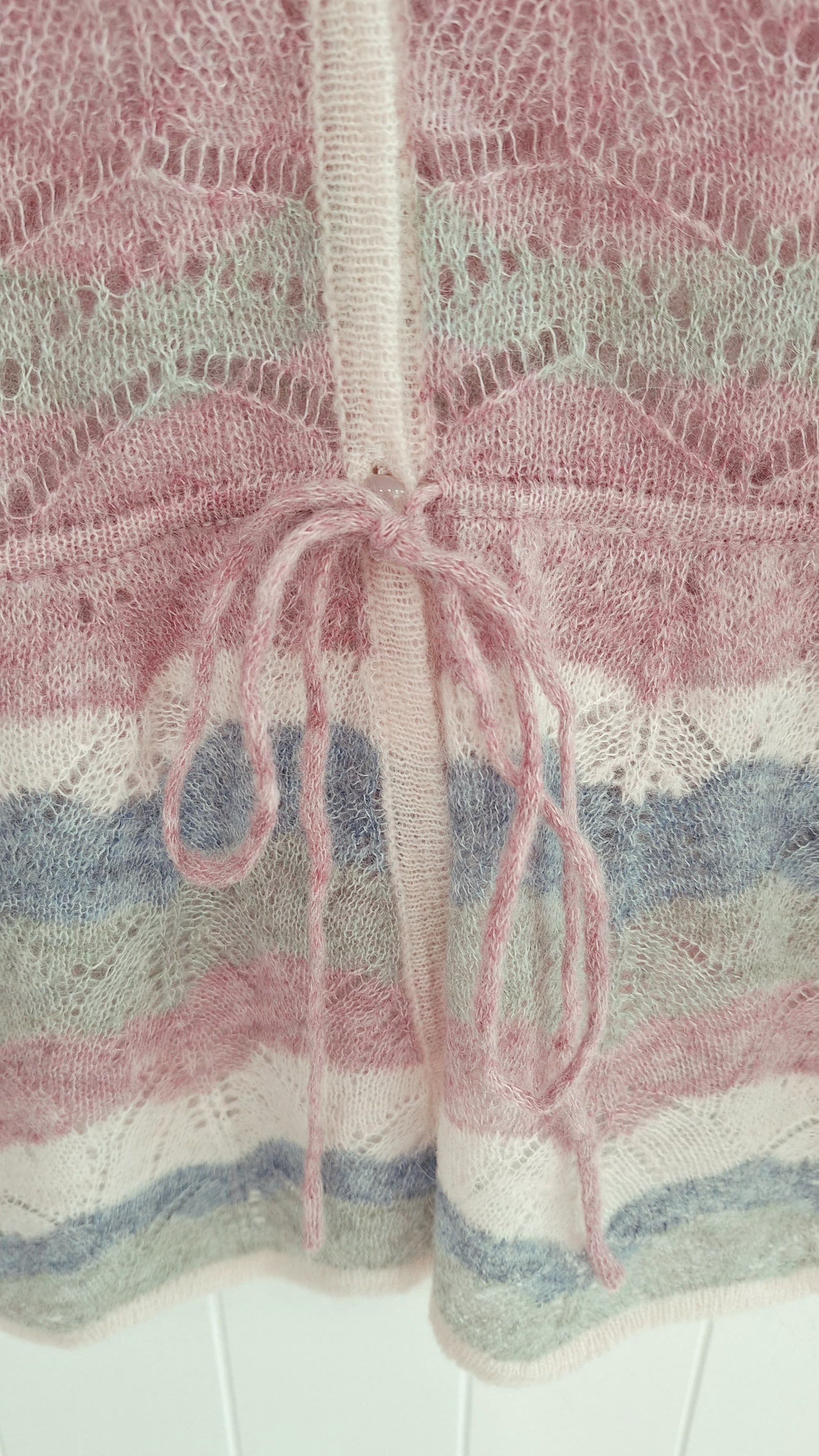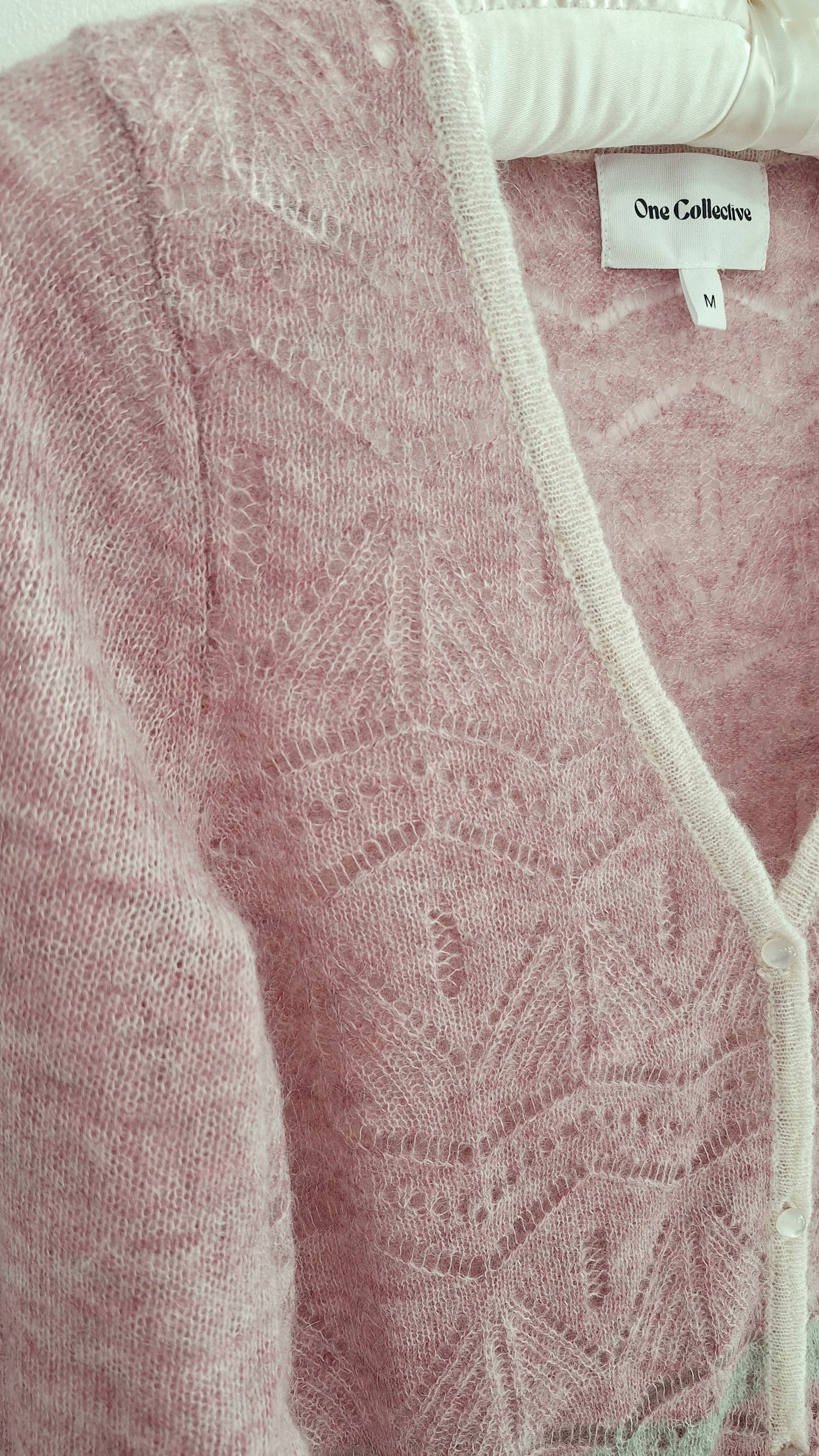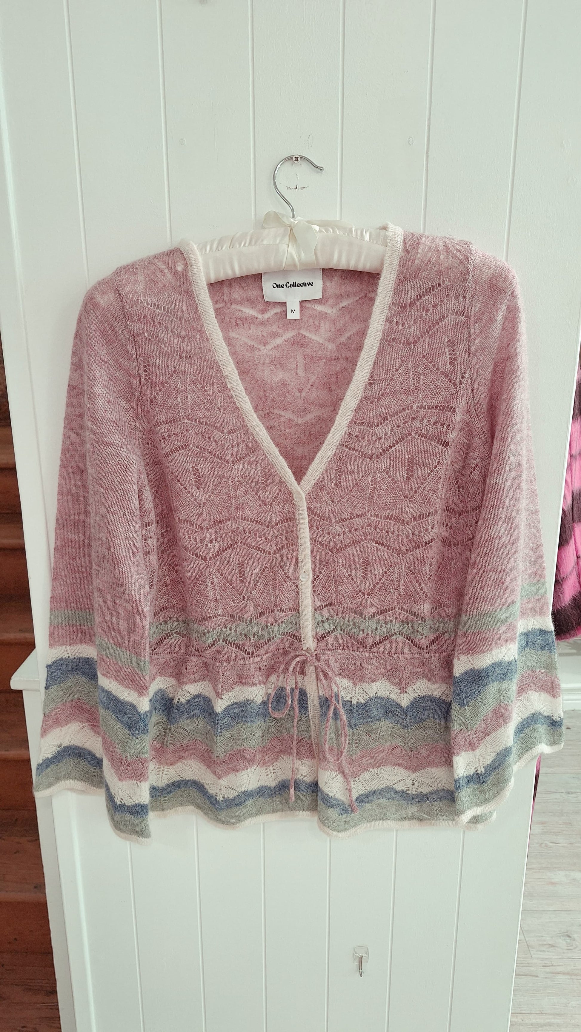Turkana is a pretty cardigan by One Collective in a delicate pointelle lace knit with pearlescent buttons and a waist tie. The body is shaped and the sleeves finish with a wide cuff and a wavy edge.