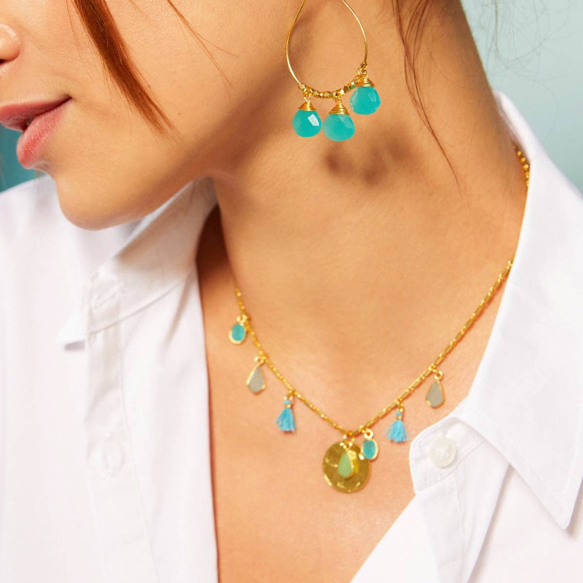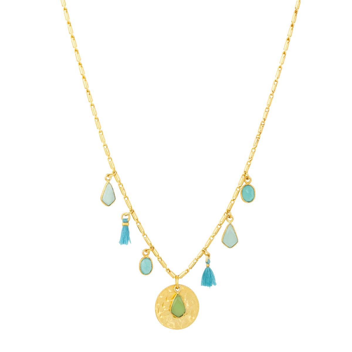 Coin and gemstone charm necklace with mini tassels in turquoise and green This short charm necklace features five set semi precious mini gemstones and two tiny cotton tassels, with a central gold coin pendant. A fun and playful piece that can be worn on its own or layered with other pieces. A matching bracelet is available from our range to create the perfect summer set.