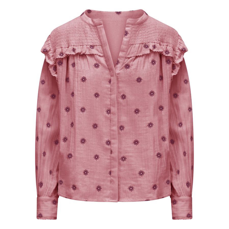 Beautiful dusky pink blouse with long sleeves and quilted yoke in soft plum floral pattern.