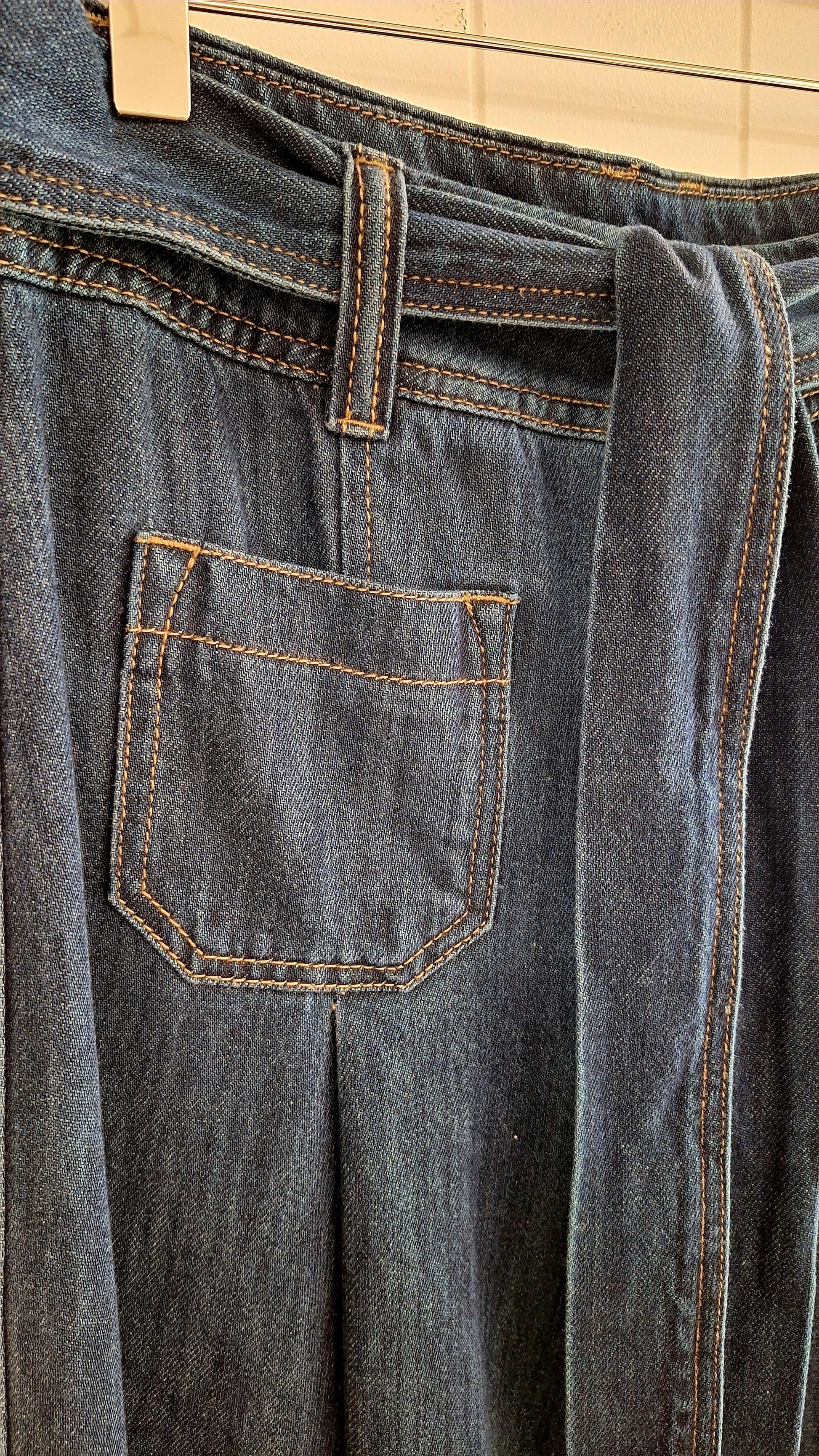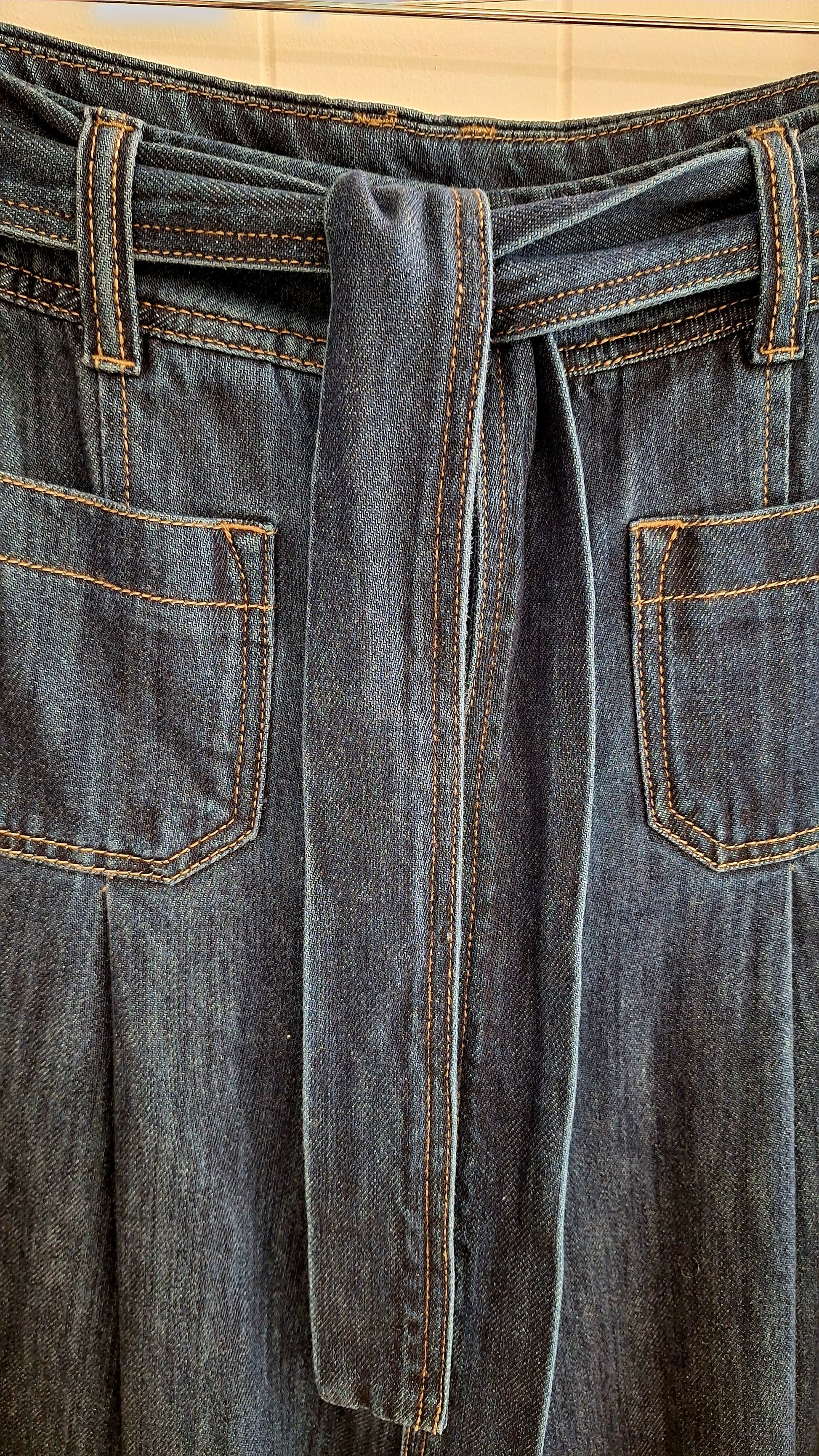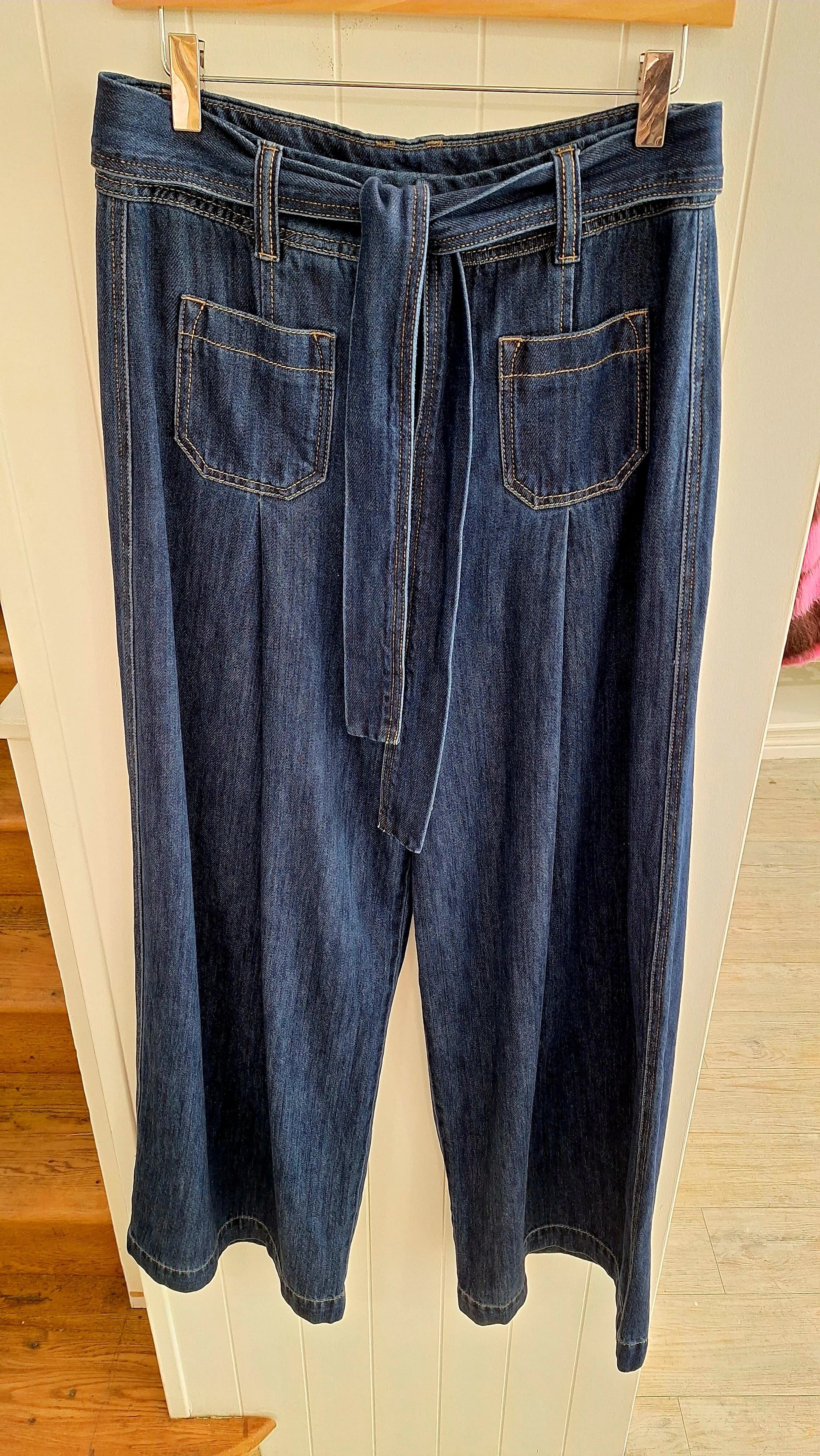 Dark denim wide legged trousers with belt tie top and folded detail.