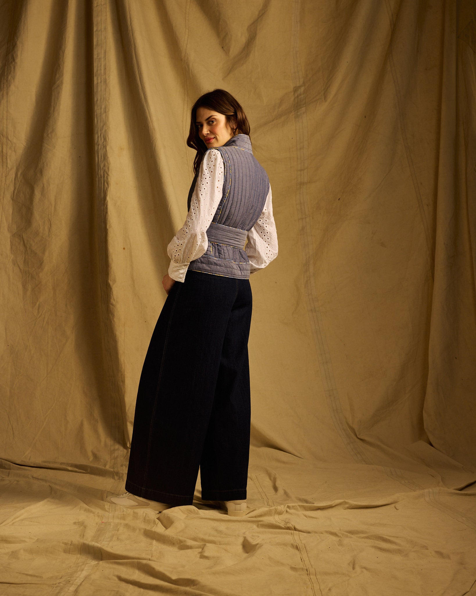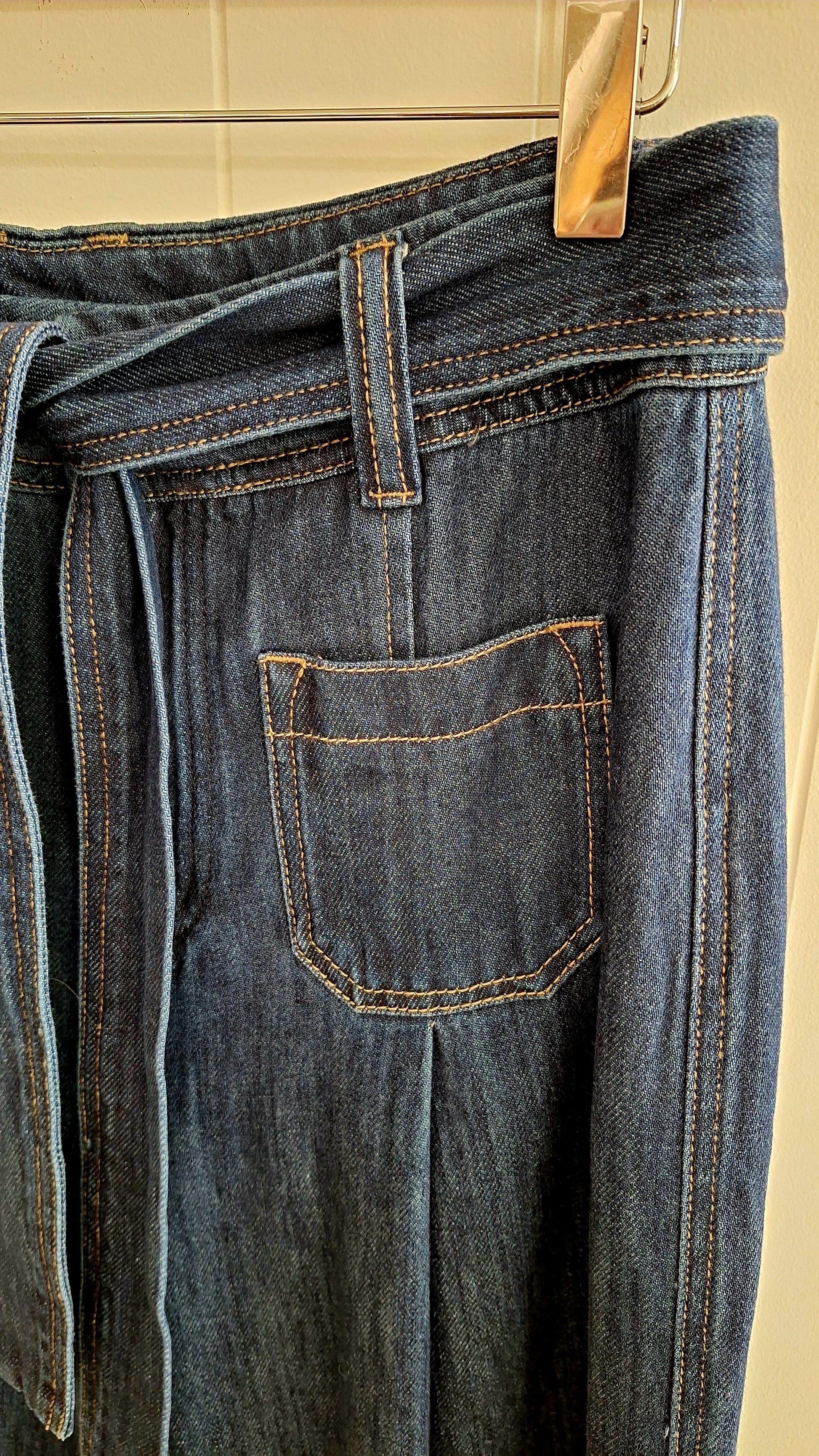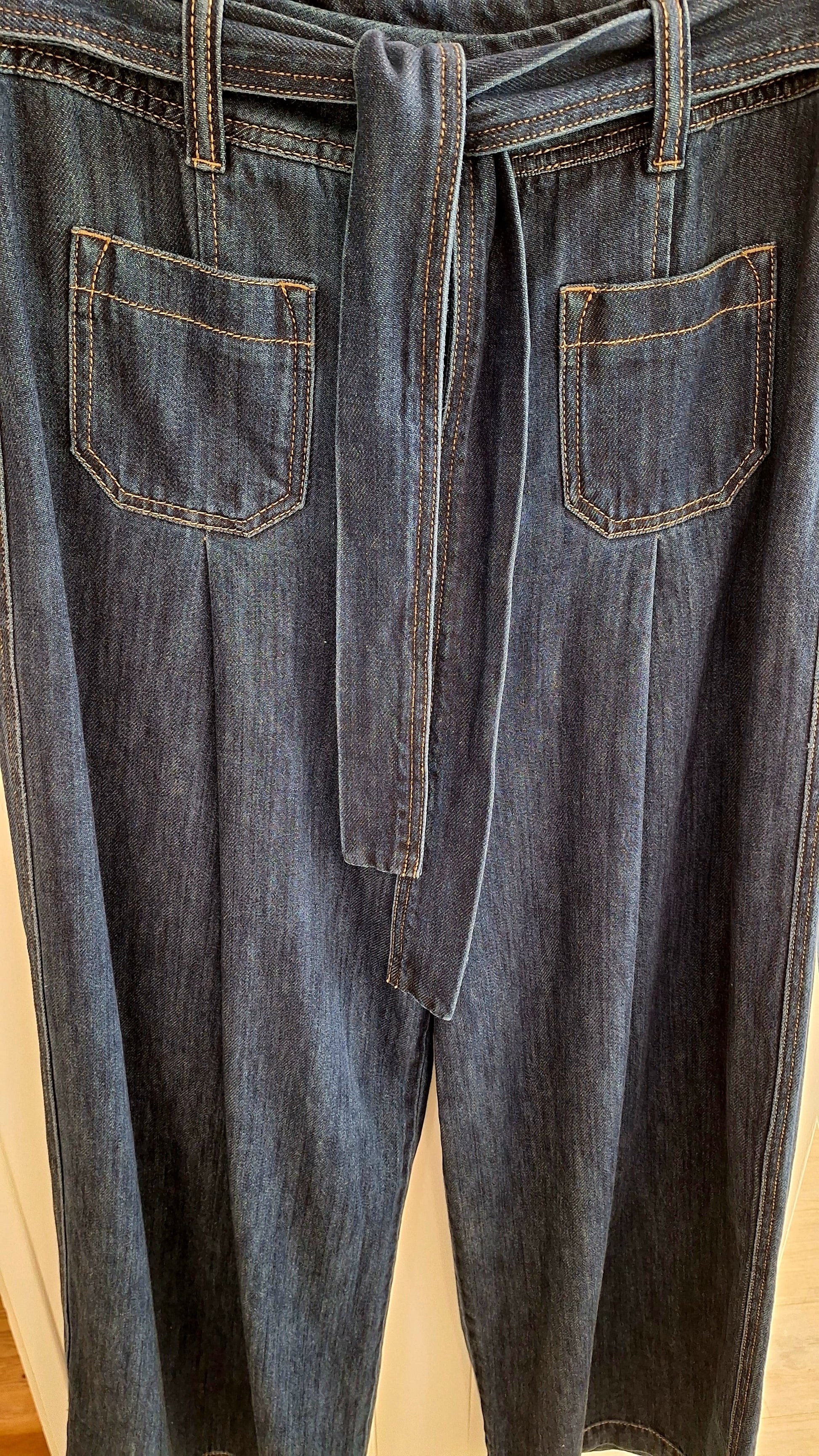 Dark denim wide legged trousers with belt tie top and folded detail.