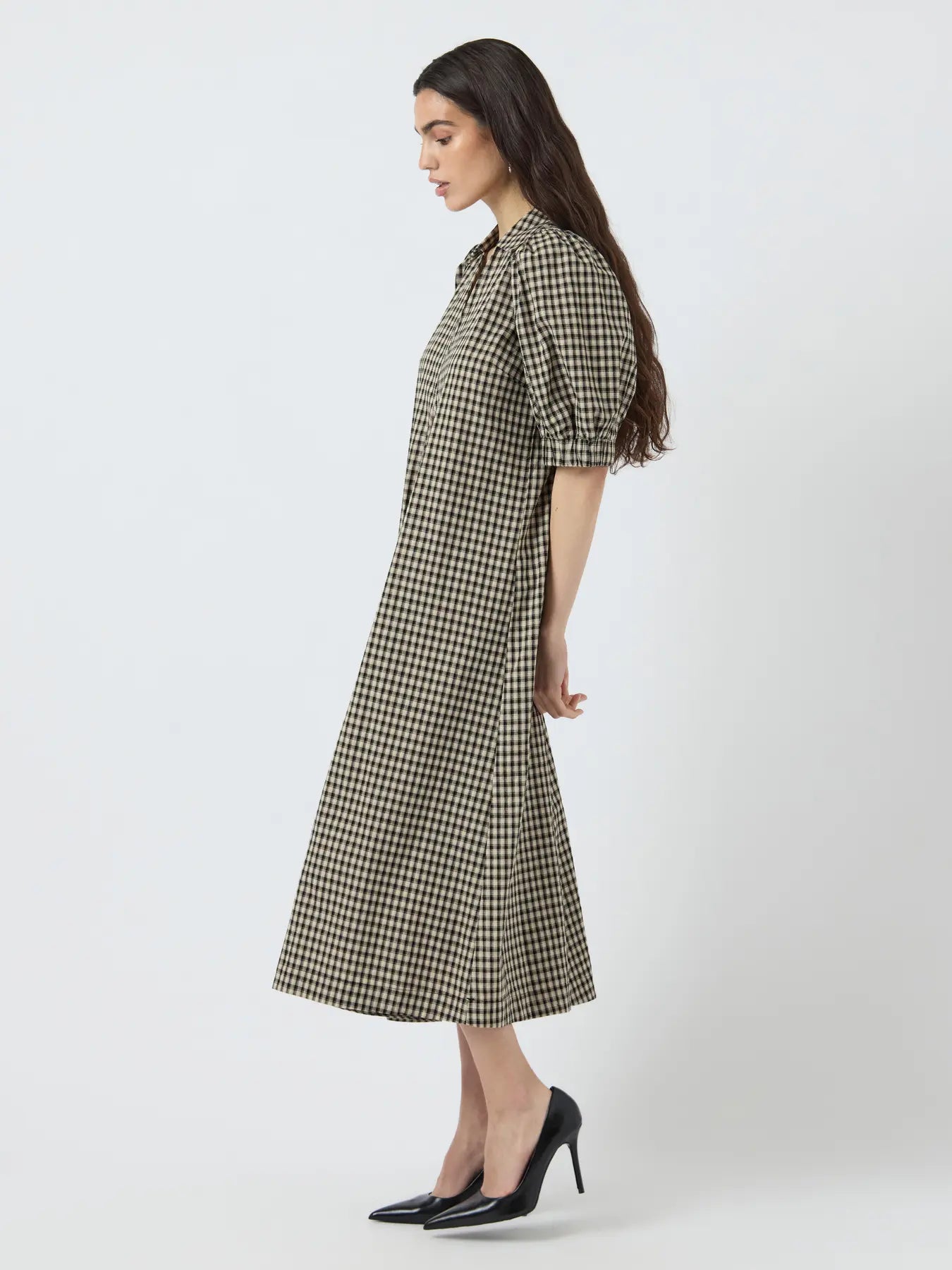 Full skirt dress with V neck and half slevves in black and taupe check. Collared for a tailored finish with puff sleeves.