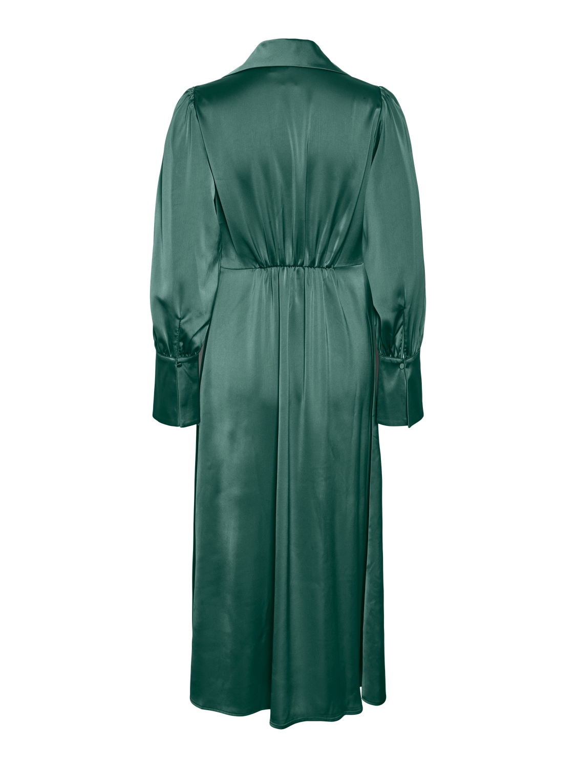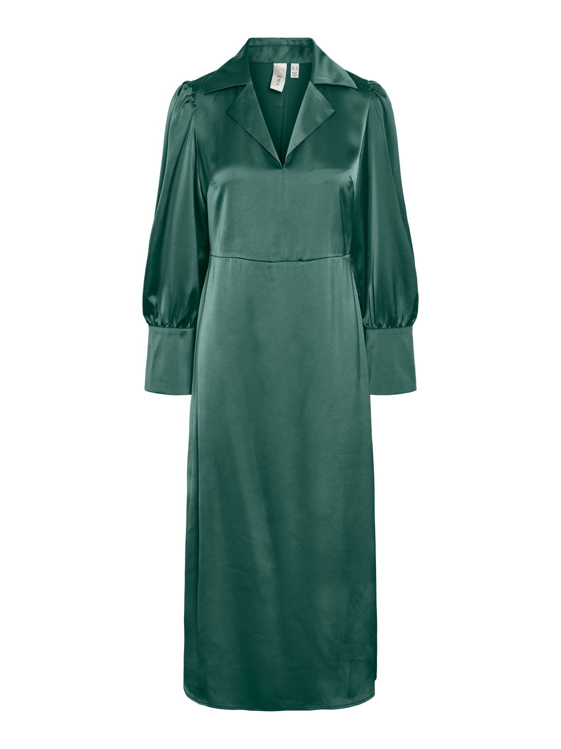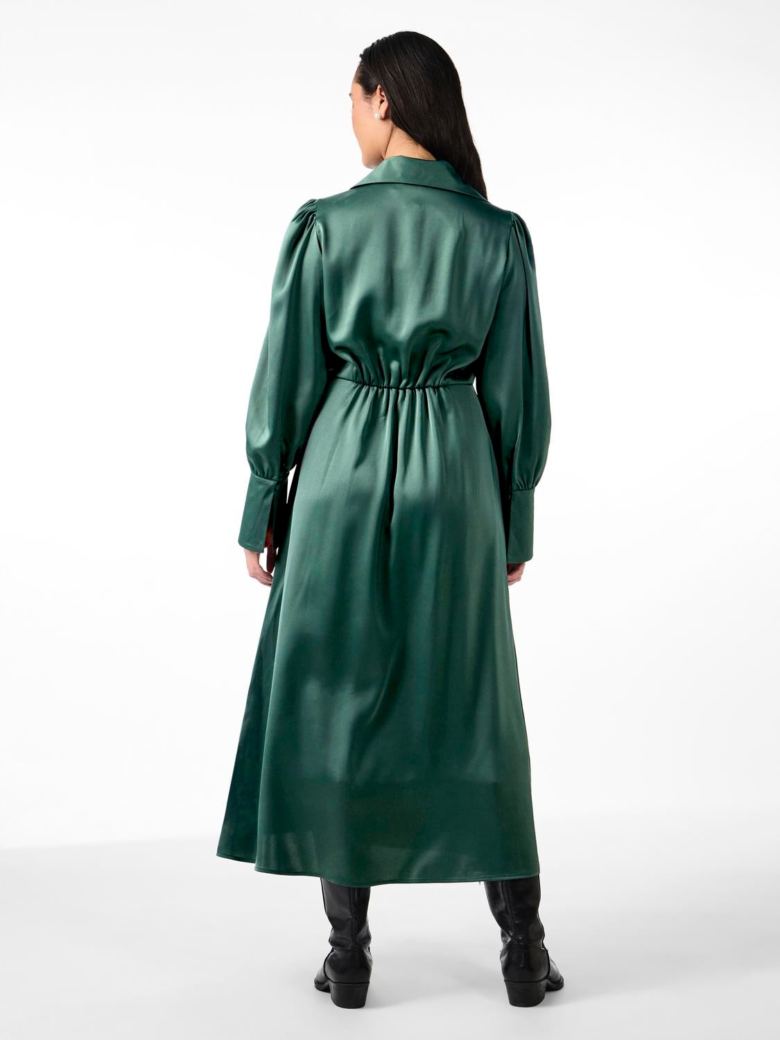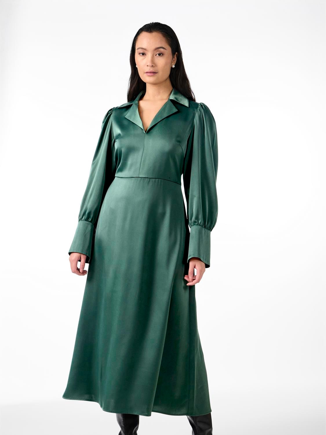 Satin midi dress - Resort collar - V-neck - Balloon sleeves with oversized cuffs - Cutline at waist - Regular fit - Model is wearing size M