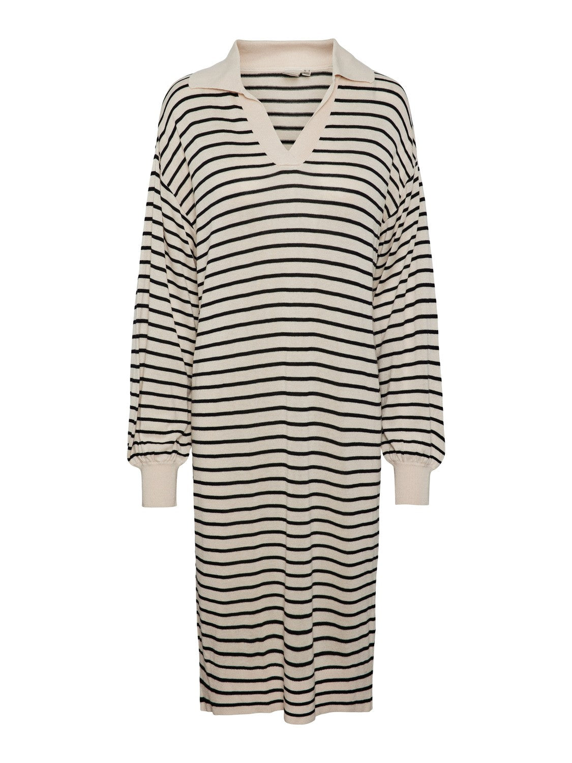 A lightweight, long sleeved, striped knit dress perfect for the late Summer and Autumn. Pair with trainers or long boots for an elegant line.